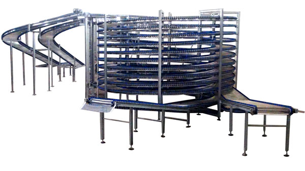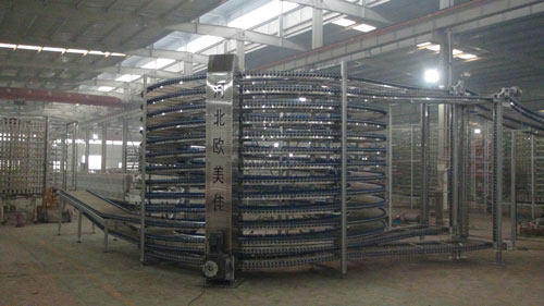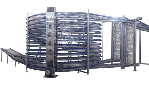 逐層傳動(dòng)螺旋塔是將減速電機(jī)的動(dòng)力通過(guò)一根主軸帶動(dòng)每層的齒輪,由齒輪撥動(dòng)每層的網(wǎng)帶而進(jìn)行運(yùn)動(dòng)。每個(gè)齒輪都帶有智能動(dòng)力傳輸器自動(dòng)調(diào)節(jié)傳輸力。